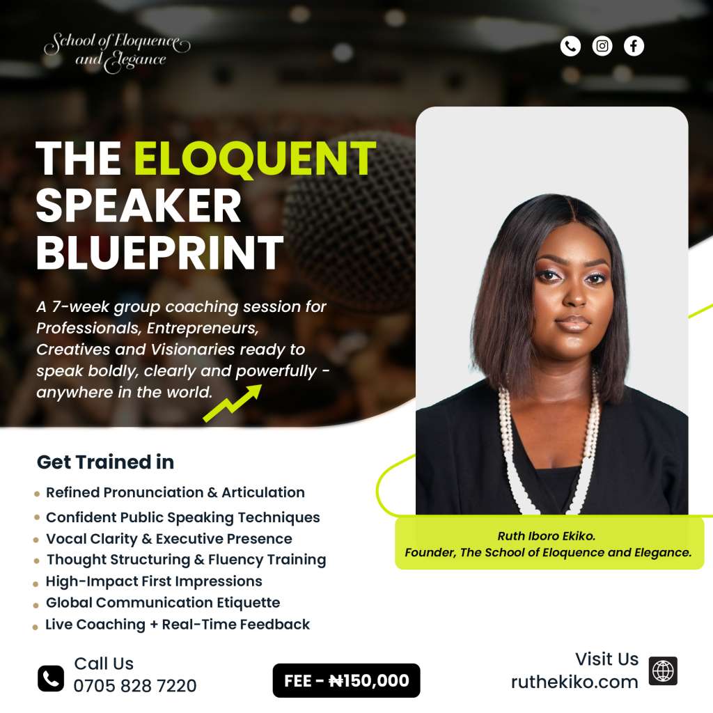 At The School of Eloquence and Elegance, we don’t just teach you how to speak - we transform the way the world listens to you. We promise that when you step into this school, you step into a refined version of yourself - the version that no longer hides behind doubt, fumbles with words, or feels overlooked in the boardroom, on Zoom, or in front of a global audience. You'll be equipped with the necessary skills to align your presence with purpose and be seen, heard and remembered.
